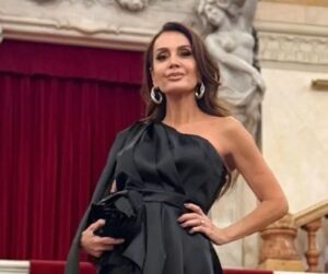 Claudia Métne realiza ensaio no Theatro Municipal com look sofisticado