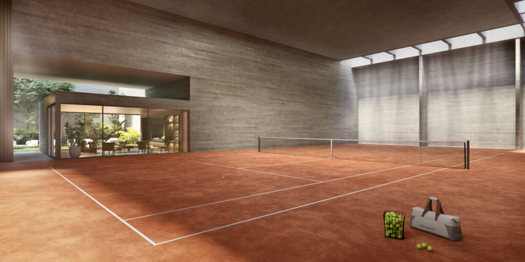 A quadra de tênis acompanha todo lazer concebido em escala grandiosa, inspirado em clubes privados e na hospitalidade internacional, para oferecer bem-estar e convivência para crianças, jovens e adultos como uma verdadeira extensão do lar. Além da quadra, o projeto contempla piscinas coberta com raia e descoberta, spa completo com sauna seca e úmida, hot hydro, cold plunge e salas de massagem, além de um fitness de alto desempenho equipado pela Technogym. Piano bar, libreria com sala de reunião e pool bar completam a proposta de encontros sofisticados.