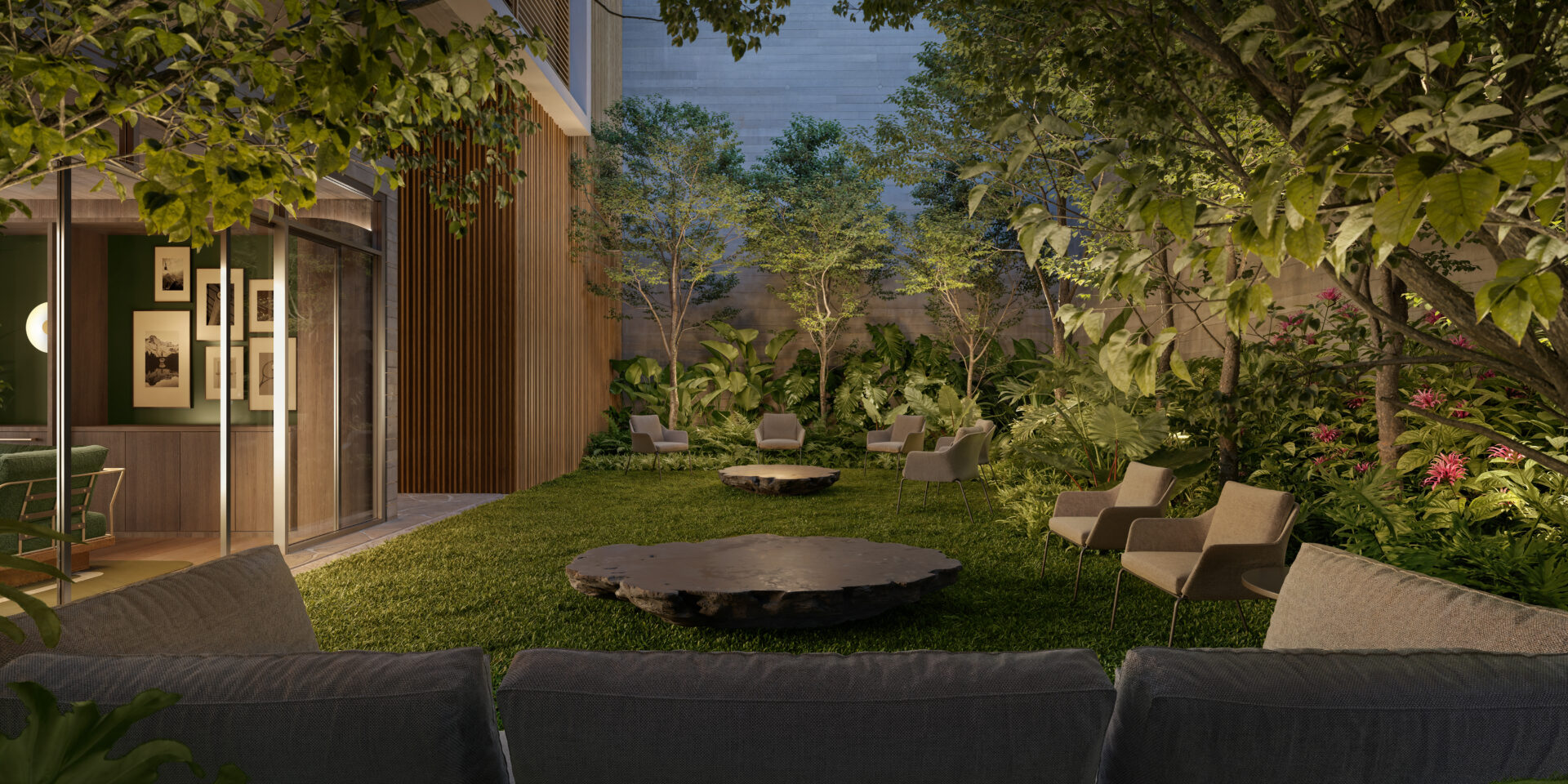 Integrado à quadra, o Tennis Lounge amplia essa experiência ao criar uma área de convivência, onde é possível confraternizar entre uma partida ou outra ao lado de uma área verde e entrada de luz natural. Com conexão para um jardim, o espaço funciona como ponto de encontro e relaxamento, fortalecendo a dimensão social do esporte.