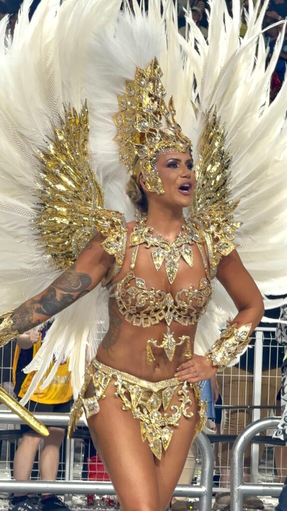 Enquanto o relógio avança e a bateria se posiciona para entrar na pista, o coração acelera no mesmo compasso do surdo. Entre retoques finais de maquiagem, ajustes na fantasia e palavras de incentivo trocadas com outros componentes, Isis demonstra confiança e entusiasmo. “É um privilégio estar aqui. Cada desfile é único e o das campeãs tem um gostinho especial”, afirma.