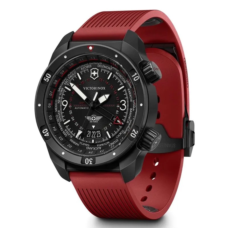 Air Pro (O Viajante Global): desenvolvido para quem vive entre diferentes fusos e rotinas internacionais. Equipado com movimento automático suíço Sellita, reúne alta complexidade mecânica em uma caixa de aço cuidadosamente polida, permitindo a leitura de até três fusos horários simultaneamente (Ref. 242006).