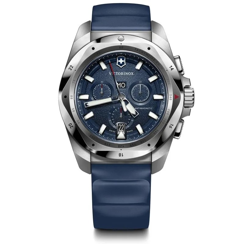 I.N.O.X. CHRONO (A Geometria da Resiliência): com seu icônico bezel esculpido e estrutura projetada para suportar testes extremos, a coleção transita naturalmente entre o ambiente corporativo e os momentos de lazer. O destaque vai para o modelo com textura refinada e pulseira em borracha azul (Ref. 241984).