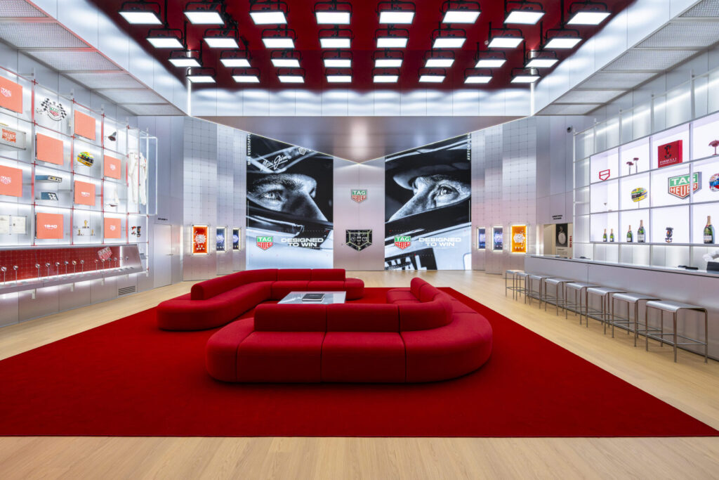 O espaço da TAG Heuer ocupa 1.000 metros quadrados dentro do universo LVMH. Embora mantenha uma estrutura arquitetônica imediatamente reconhecível, a cenografia foi completamente reinventada para destacar as mais recentes inovações da marca e o legado duradouro do TAG Heuer Monaco.